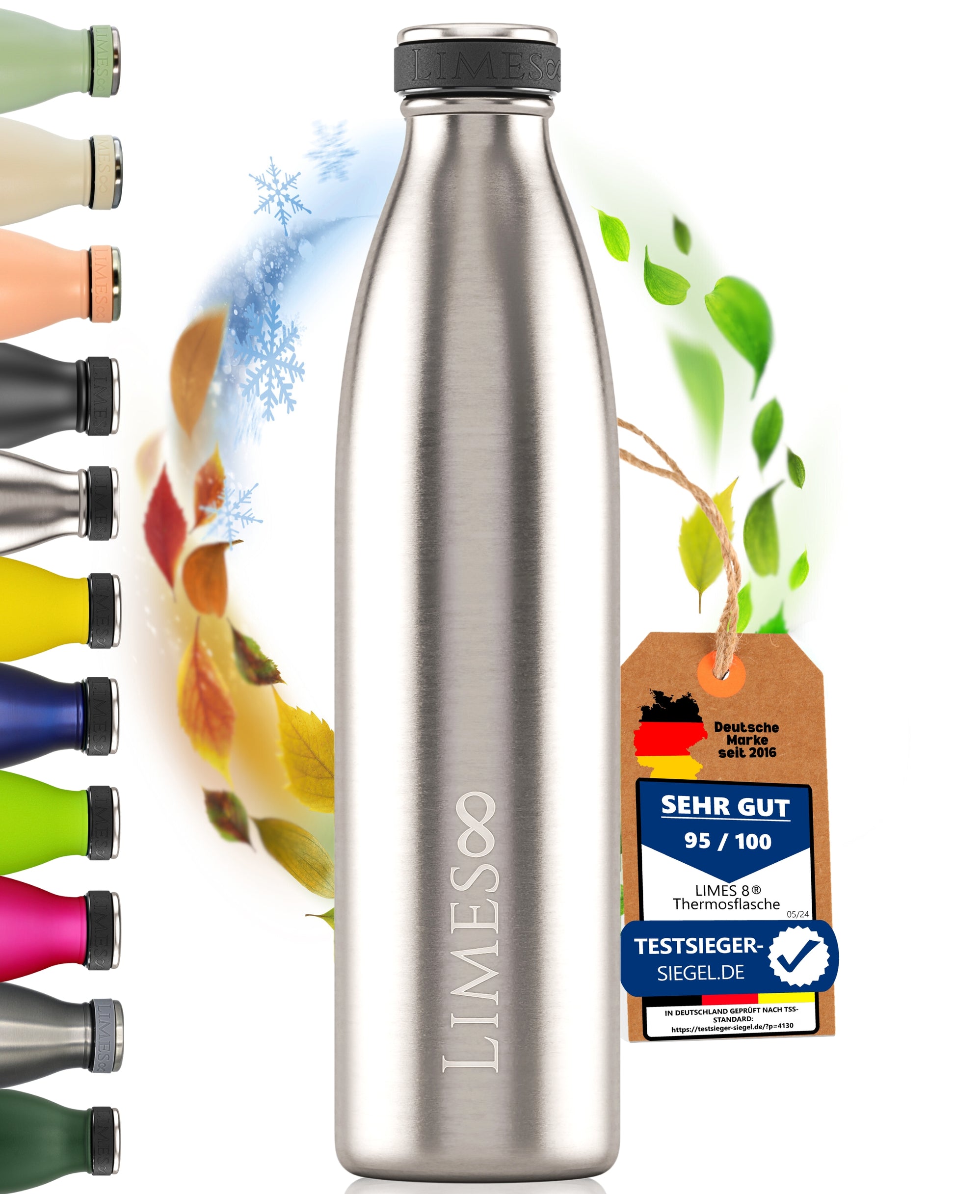 Limes 8® Thermosflasche 1L "FourSeasons" [HEIß & KALT] Trinkflasche Edelstahl 1L - Auslaufsichere Trinkflasche 1L Kohlensäure geeignet - Isolierkanne - Thermo Trinkflasche für alle 4 Jahreszeiten Stainless